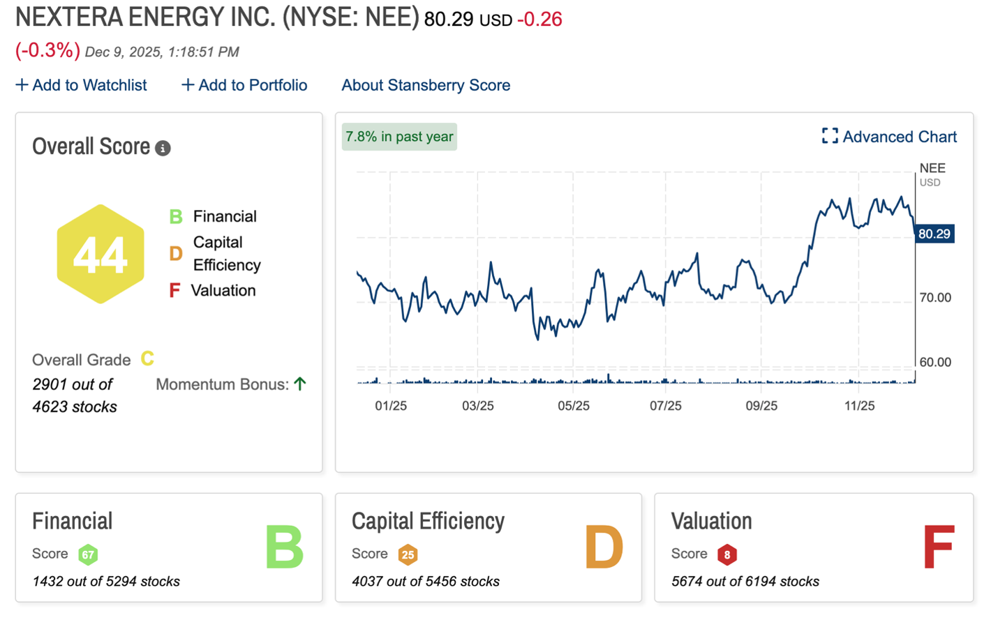 Looking at our proprietary Stansberry Score, which measures a stock’s prospects as a long-term investment, NextEra gets an overall score of 44. That’s good for an overall grade of “C.”