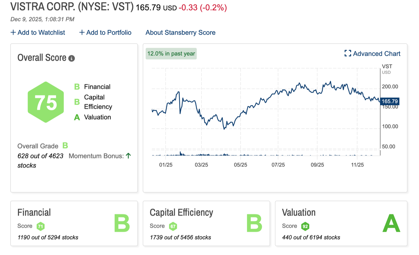 Competitors like Talen Energy (TLN), Vistra (VST), and NRG Energy (NRG) all receive higher grades on our proprietary ranking system. Vistra receives the highest grade at 75 out of 100, including an “A” grade for valuation.