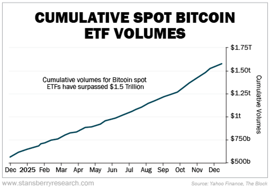 The demand was clear. U.S. spot bitcoin ETFs did around $4.6 billion in trading volume on their first day. And BlackRock’s IBIT became the fastest U.S. ETF to ever hit $10 billion Assets Under Management (“AUM”), just under two months after launch. By mid-2025, spot bitcoin ETFs had already crossed $50 billion in cumulative net inflows. And now, they’ve seen over $1.58 trillion in cumulative volumes.