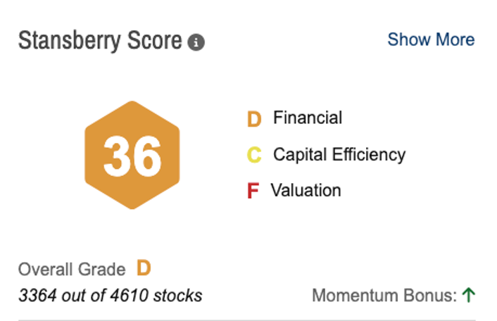 With an overall score of 36, INTC gets a D grade. While it receives moderate capital efficiency marks, Intel’s valuation score is about as low as it gets. That’s not surprising. Remember, the company is posting negative earnings. So, there’s no point in looking at its price-to-earnings ratio.