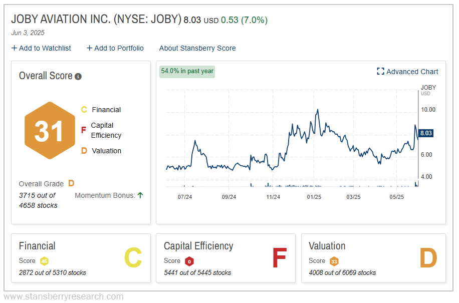 Our Stansberry Score doesn’t seem to think so. Take a look at how our proprietary grading system ranks Joby…