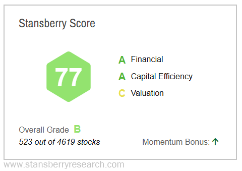 The company earns “A” grades for both its financials and capital efficiency. But it only gets a C for valuation – thanks to its high forward price-to-earnings (P/E) ratio of 28.