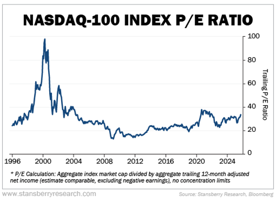 The Nasdaq 100 reached a truly absurd valuation in 2000. Its trailing P/E reached nearly 100.