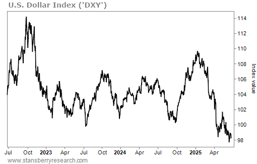 The U.S. Dollar Index (“DXY”) – a measure of the dollar against a basket of major currencies – has been getting weaker for the past two years. But the decline accelerated in early 2025.