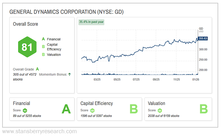 Our Stansberry Score gives General Dynamics an overall “A.” It’s one of the top 300-or-so stocks out of nearly 4,600 we follow.
