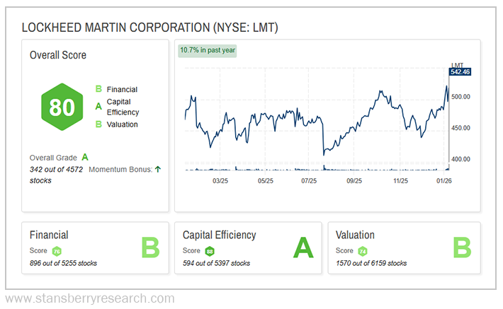 Our proprietary Stansberry Score, which gauges the long-term investment quality of a stock based on multiple factors, reinforces that statement. Out of nearly 4,600 stocks we track, LMT ranks within our top 350, with a stellar overall “A” grade.
