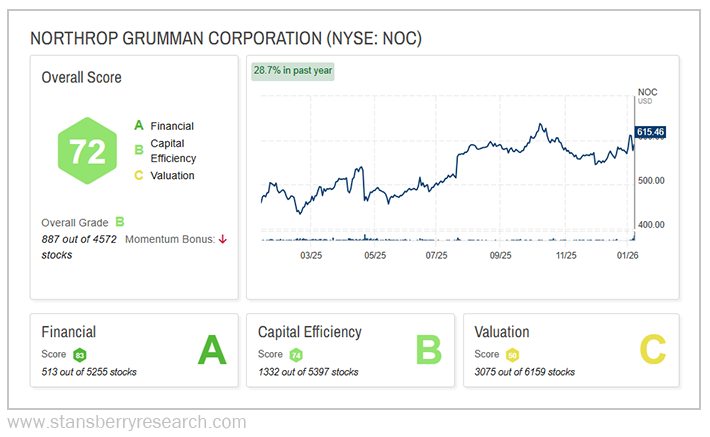 While not quite as strong overall as Lockheed or General Dynamics, Northrop’s stock is another strong performer. As you can see from our Stansberry Score, NOC places well within our top 1,000 stocks with a solid “B” overall grade.
