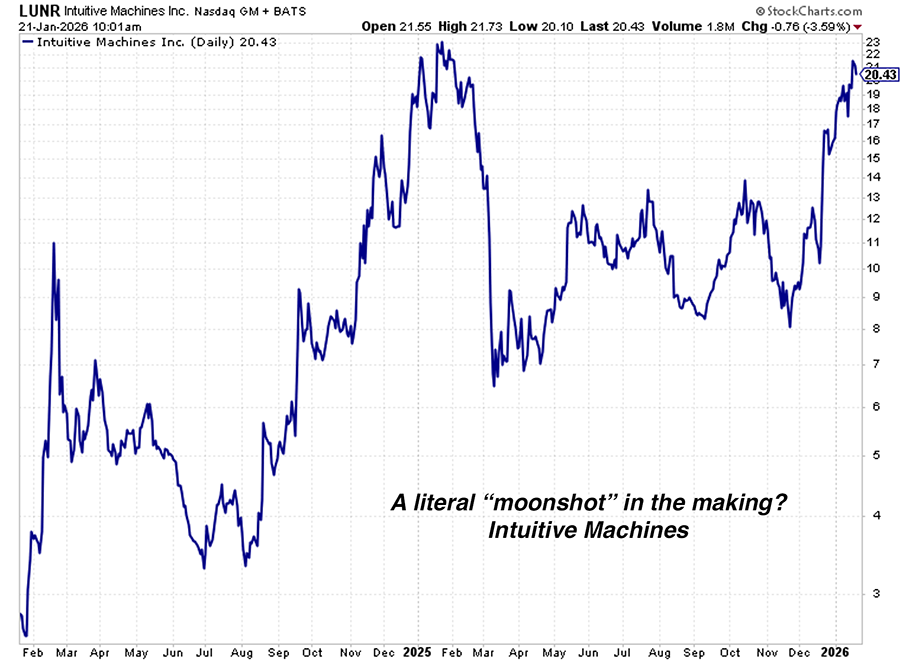 Intuitive Machines (LUNR): This is the only public company with a successful commercial lunar landing. On top of that, it has a huge NASA CLPS contract and a $4.8B communications contract that runs into the 2030s. The stock is only valued at $3.2B today.