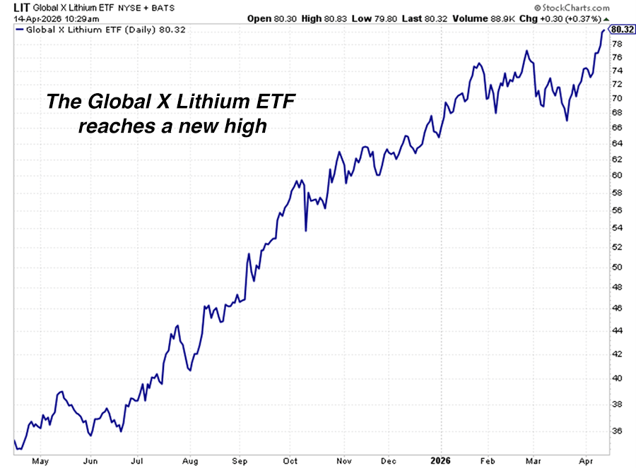 The lithium mining sector recently suffered from a supply overhang. Strong demand growth from the markets above, however, has driven lithium prices 57% off their 2025 lows and lithium miners and LIT to new highs.