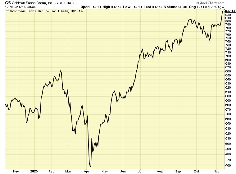 As you can see in this 1-year chart of Wall Street giant Goldman Sachs, we’re getting clear bullish signs from the market. Today, Goldman surged 2.7% to reach a new all-time high.