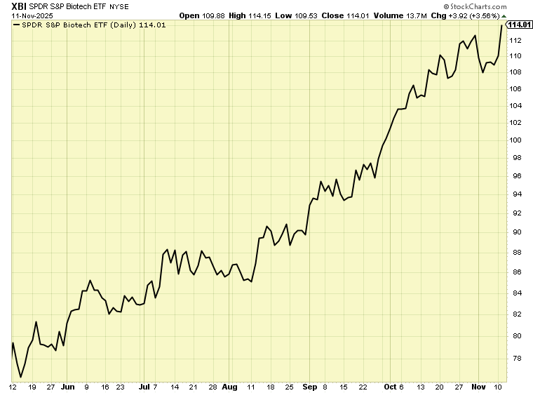 Regular readers are familiar with our bullish stance on biotechnology. On August 18, I sent a research note to colleagues detailing my bullish take on the biotech sector’s price action. Since then, I’ve written eight updates on the biotech bull market, as the sector has outpaced the S&P by a factor of four.