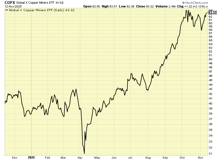Since our note, copper and copper stocks staged a large rally, one that was met with heavy selling in October. Since then, copper stocks – as represented by the Global X Copper Miner ETF (COPX) have moved in a sideways consolidation pattern.