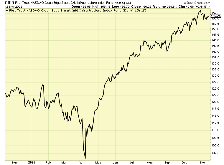 Speaking of a run at previous highs, keep an eye on the Power Grid Upgrade theme and its representative ETF – the First Trust NASDAQ Clean Edge Smart Grid Infrastructure Index Fund (GRID).