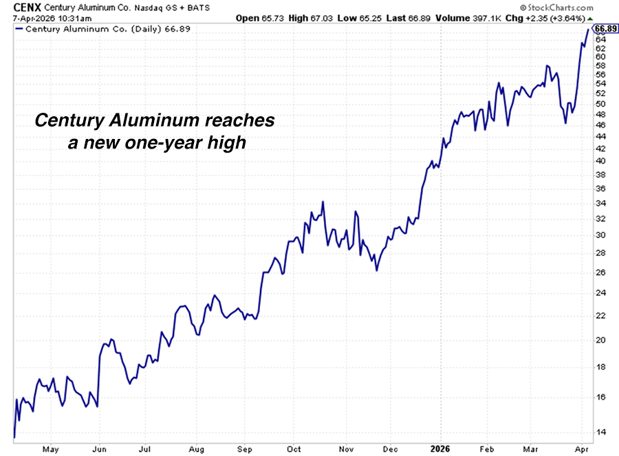 Although it isn’t getting much press, U.S. aluminum producers are doing well. Today, leading aluminum product manufacturers Alcoa (AA) and Century Aluminum (CENX) broke out to new highs.
