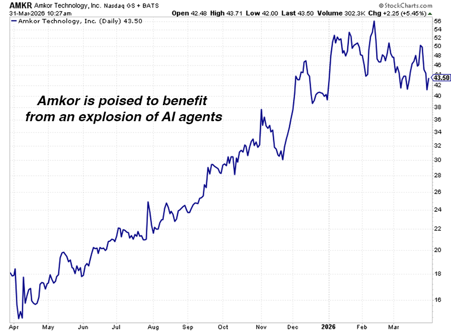 Amkor (AMKR): Amkor is a $11 billion market cap “picks and shovels” play on the Agent Supernova. It sits at the point where AI chips become usable hardware. It is one of the largest advanced packaging and test houses for high-performance semiconductors, integrating CPUs, GPUs, and HBM into dense, power-efficient AI systems. As agentic AI drives more compute with CPU, GPU, memory chiplets (as opposed to predominantly GPUs), into very tightly packed 2.5D and 3D packages – AMKR’s advanced packaging demand soars.