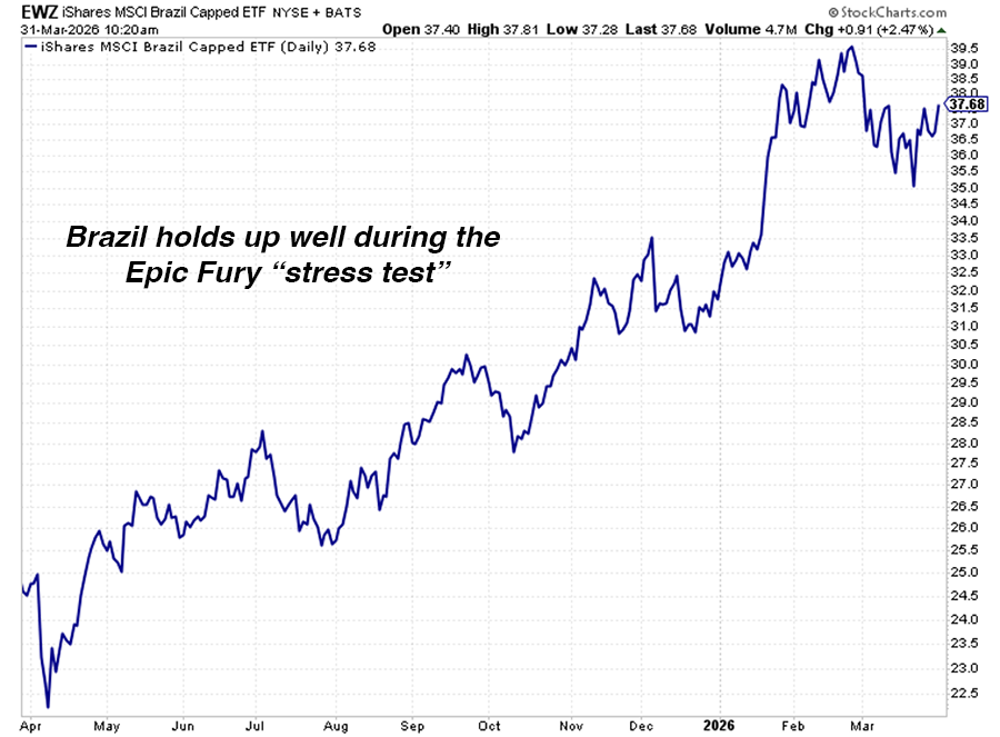 However, the iShares Brazil ETF (EWZ) is down just 2.6% since Epic Fury started. It’s just 5% off its all-time high set in February. This is a very impressive performance for Brazil.