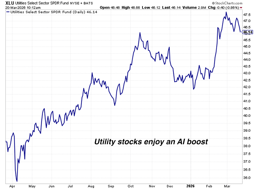 One of my recommended ways to invest in this megatrend is via electric power producers… aka “electric utilities.” When you invest in utilities, you are not risking your money by trying to pick the company that creates the best AI-powered software application or the best AI-powered travel site.