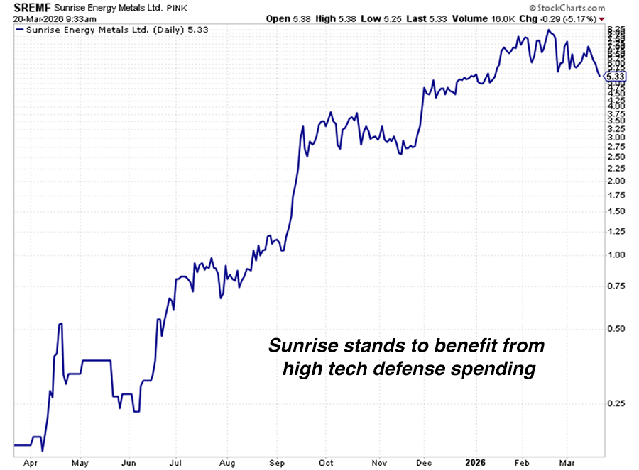 Sunrise Energy Metals (SRL): SRL is another small-cap mine developer. Its Syerston project in Australia is one of the largest scandium resources in the world and contains nickel and cobalt as well. Sunrise is slightly less risky than Doubleview because its project is development-ready with key permits in place. Sunrise has also signed a five-year scandium option with Lockheed Martin (LMT), giving LMT the right to purchase up to 25% of Sunrise’s scandium. The company is backed by mining powerhouse Robert Friedland.