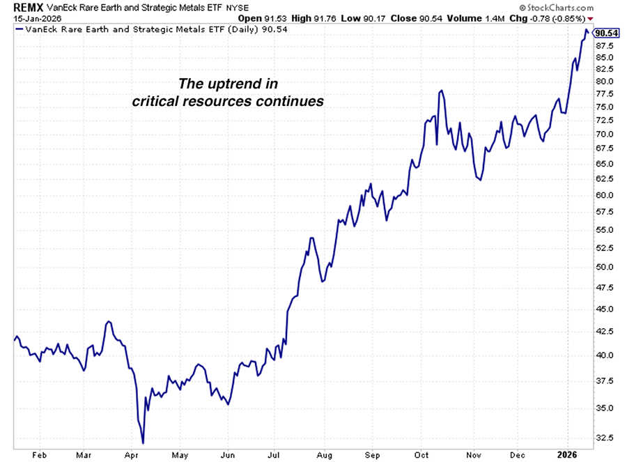 As you can see in the one-year chart below, this trend is moving. REMX had a strong 2025, spent time consolidating at year’s end, and just broke out to a new high.