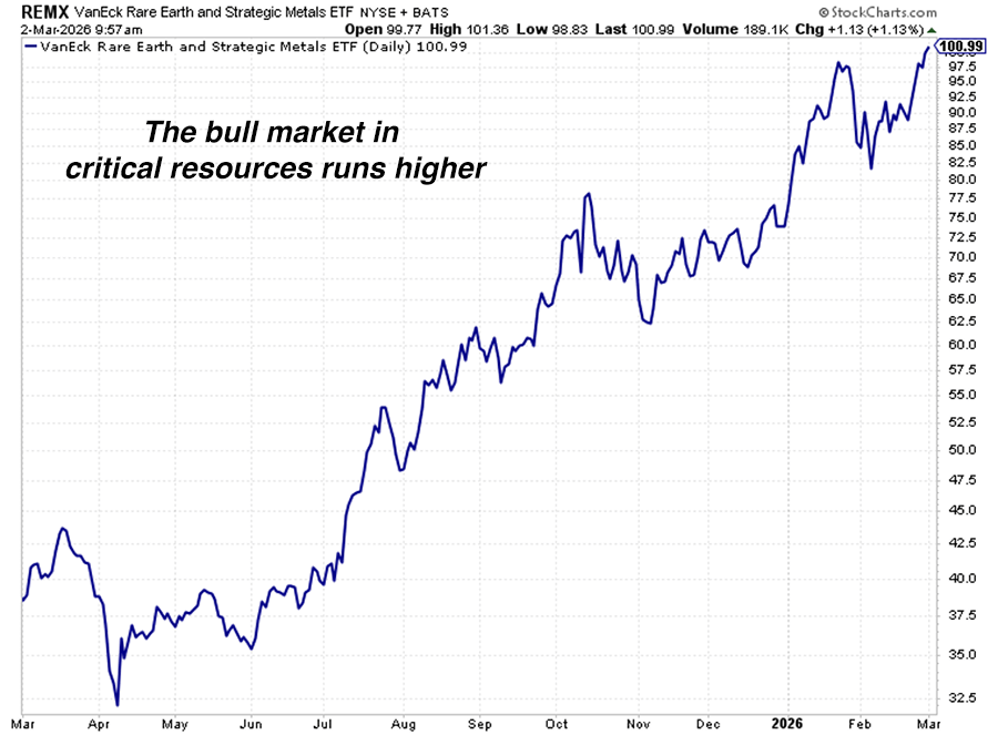 As you can see in the one-year chart below, this trend is moving. REMX had a strong 2025, spent time consolidating at year’s end, and just broke out to a new high. The strike on Iran drove this price action by reminding us that resources are scarce and often the cause for conflict.