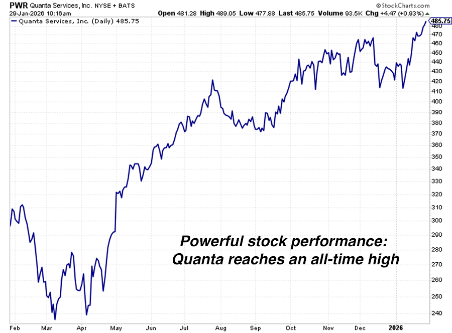 Over the past year, Quanta is up 64%… far outpacing the S&P 500. This week, the stock reached an all-time high. The Power Grid Upgrade bull market is alive and well.