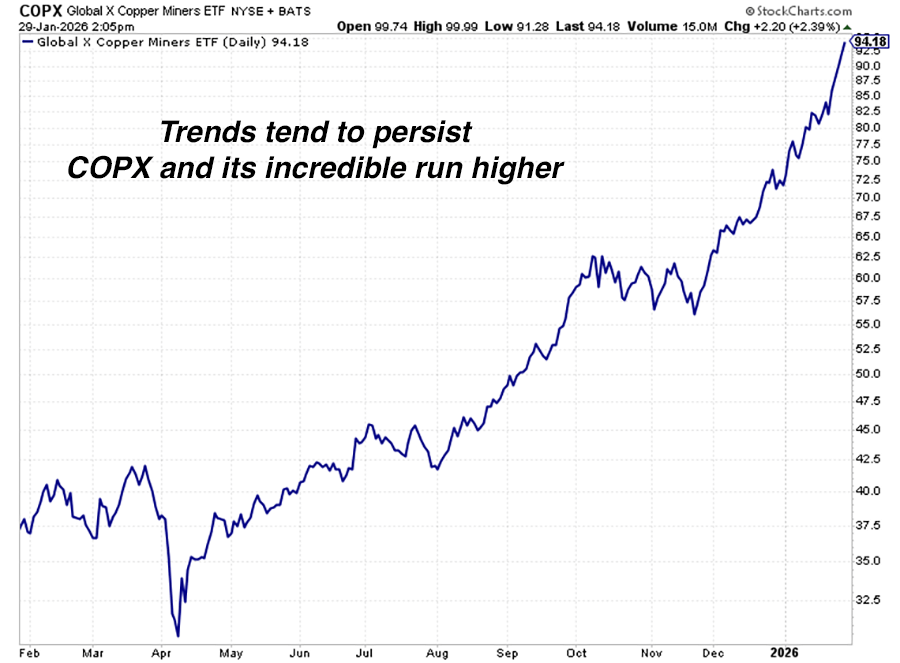 The big move in copper miners is one of the biggest and best trades of the past few years. It reminds us that yes, Isaac Newton was right. An object in motion tends to stay in motion. Trends tend to persist. I expect this one to do just that. Still long.