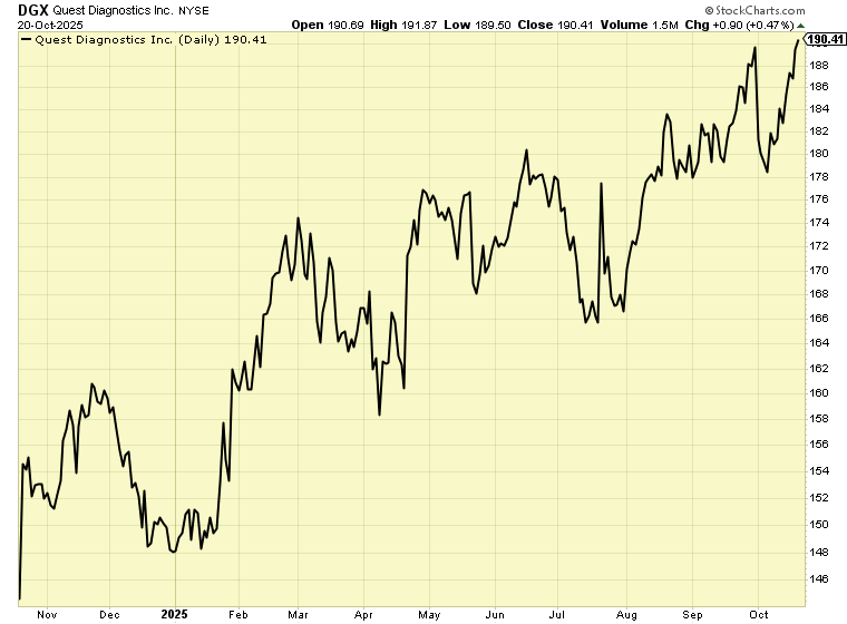 I’ll also point out that America’s two leading health care testing companies, Quest Diagnostics (QDX) and Labcorp Holdings (LH), reached new 52-week highs this week. If you’ve ever had a doctor order any test for you, chances are good it was through Quest or Labcorp.