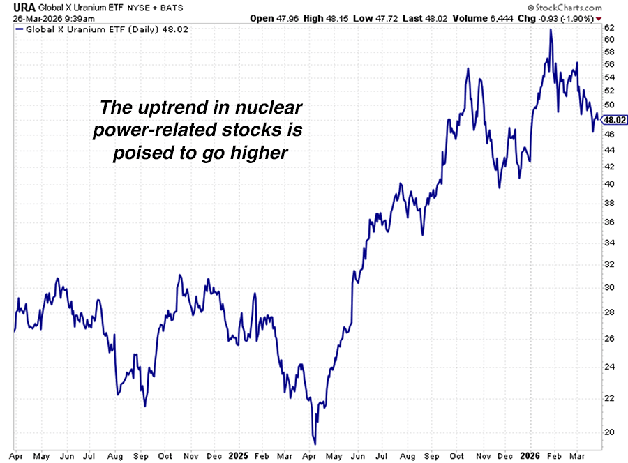 This demand is driving a big bull market in virtually every form of electric power production. In these pages, I’ve highlighted trends and opportunities in solar energy, nuclear energy, utility stocks, natural gas producers, and Power Grid Upgrade investments.