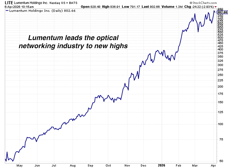 Since reaching an all-time high in January, the benchmark S&P 500 index is down about 5%. This Epic-Fury-induced weakness has led to far fewer industries reaching new all-time highs than we see in “less chaotic” geopolitical and business environments. But in a bullish development, optical networking is one such industry where stocks are either trading near their all-time highs or setting them. When an industry reaches new highs during a period of broad market weakness, it’s a sign the fundamental drivers of that industry are extraordinarily strong.