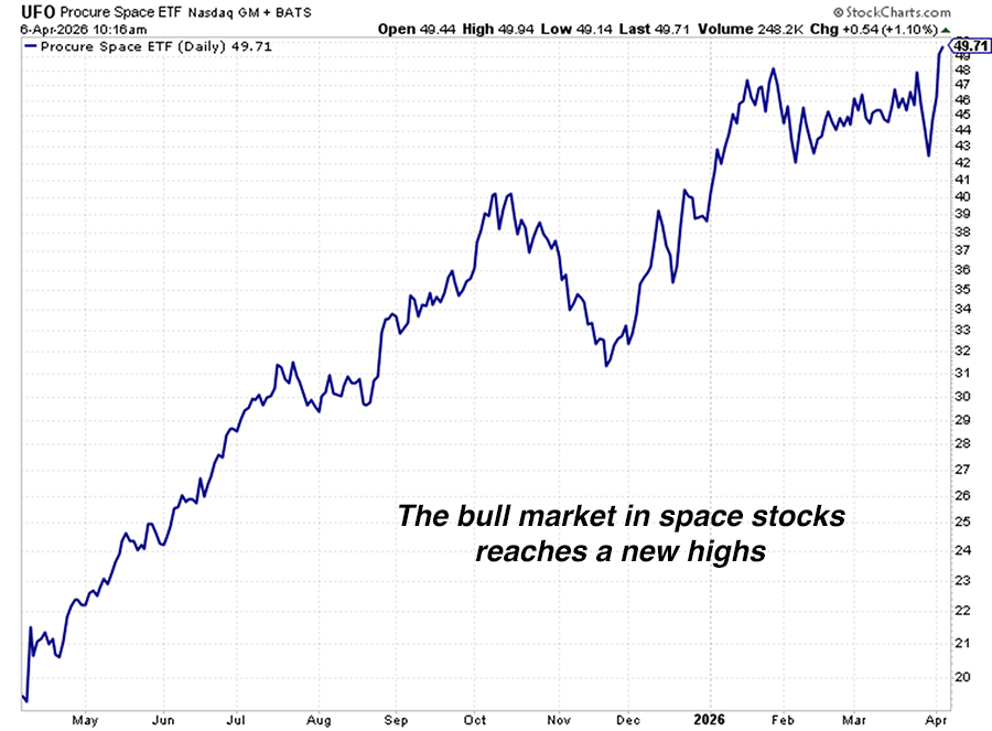 Last September, we put a spotlight on the upside breakout in space stocks and said it’s a sector the “public could go wild for.”