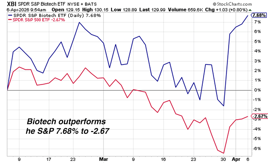While we’re talking about industries and themes doing well in a weak overall market, we must also mention the biotechnology industry. It’s another sector that is passing the Epic Fury-induced “stress test” with an excellent grade.