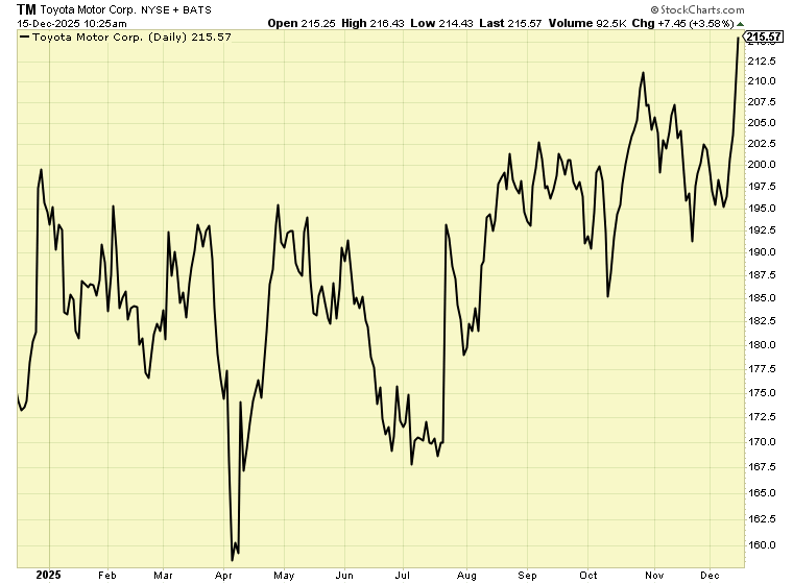 There’s no pure automaker ETF. But we can track these businesses as a whole and say they are in a bull market. We look at charts like the one of Toyota below and ask, “Can things be all that bad in the economy?” (Answer: No)