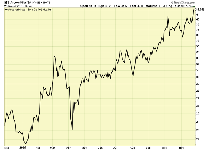 ArcelorMittal is the world’s largest publicly traded steelmaker. It makes a wide variety of raw materials used in cars, trucks, construction equipment, buildings, and infrastructure. Today, MT shares reached a new high. The stock is up 71% year-to-date.