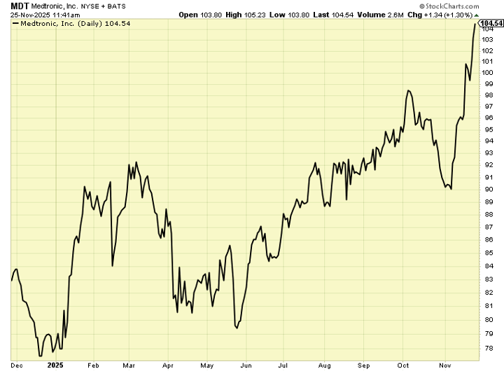 Importantly, health care blue chip Medtronic (MDT) also hit a new 1-year high today. Medtronic is America’s largest medical device maker by revenue. It’s a massive player in the cardiovascular health and surgical tools industries.
