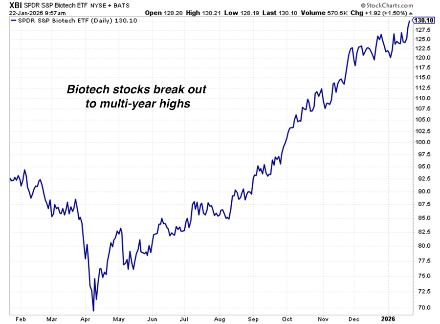 The biotech sector spent December trading sideways and digesting its big 2025 gain. But today, the sector – as represented by the S&P Biotech ETF (XBI) – broke out to a new multi-year high. I expect this trend to keep running.