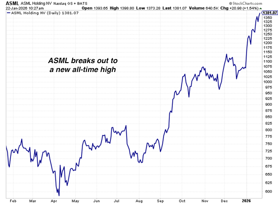 The semiconductor supply chain keeps going strong. Big players such as ASML (ASML), Micron (MU), Lam Research (LRCX), and Applied Materials (AMAT) all reach new yearly highs.