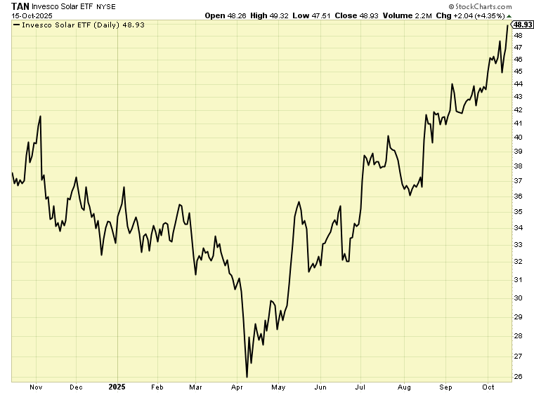 But around here, the fundamentals of a trend are less important than what the market thinks of a trend. Right now, the market likes the bull case for solar stocks. This week the Invesco Solar ETF (TAN) broke out to a new 12-month high. TAN is up a big 15% in just the past month.
